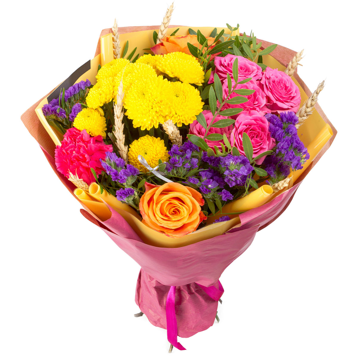 Роза одноголовая розовая и оранжевая, хризантема желтая кустовая, гвоздика розовая, колос, статица фиолетовая. Упаковка (лента, пленка, крафт, сетка, пленка матовая)