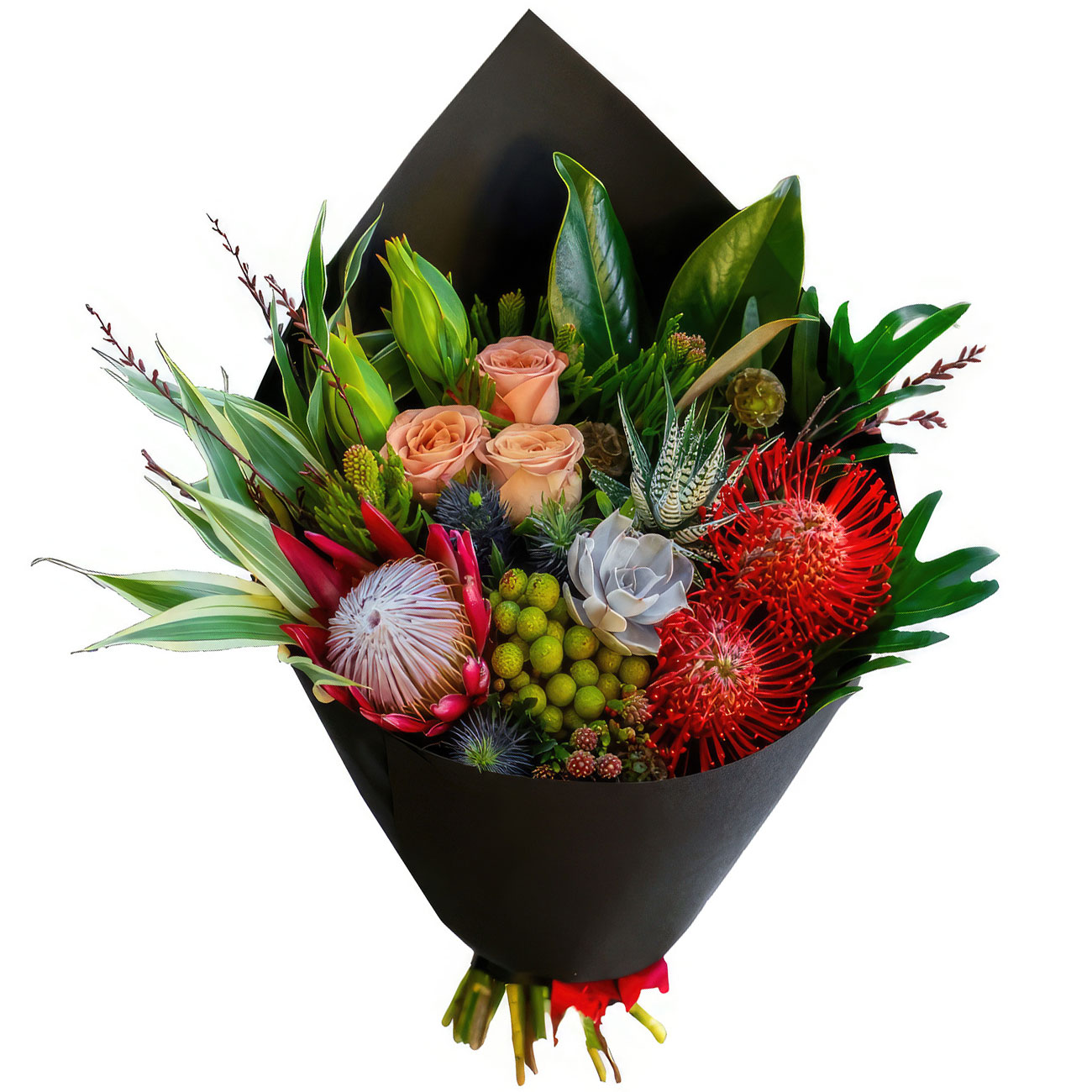 Эрингиум, протея, леукоспермум, роза одноголовая Капучино, эхеверия, скабиозы, леукодендрон, лагурус, бруния, декоративные листья, декоративная зелень. Упаковка (лента, пленка, крафт, сетка, пленка матовая)