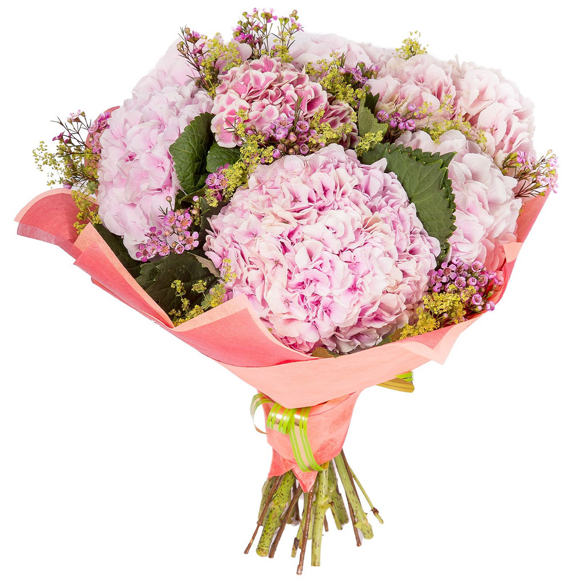 Гортензия розовая, ваксфлауэр. Упаковка (лента, пленка, крафт, сетка, пленка матовая)