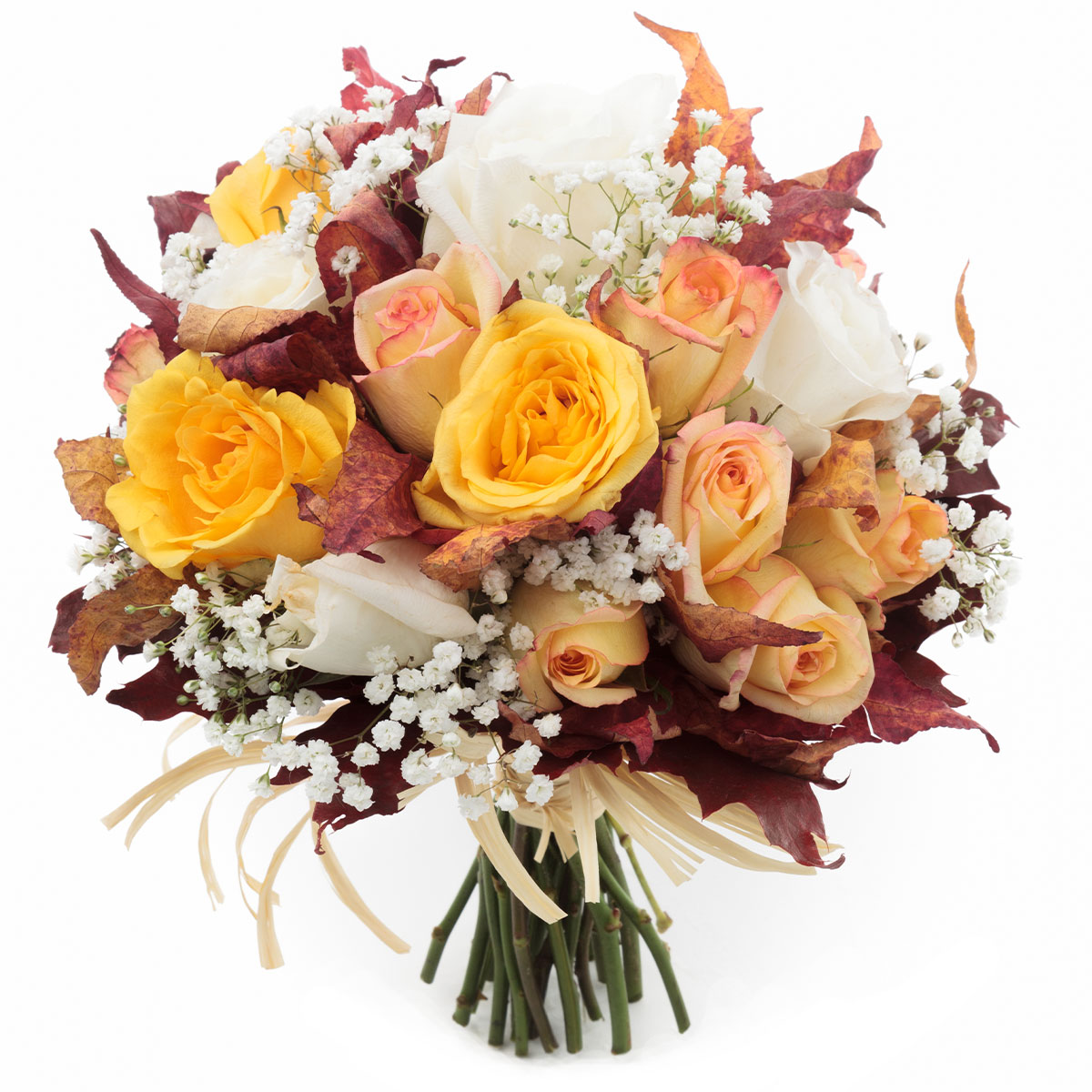 Роза одноголовая кремовая и жёлтая, кленовые листья, гипсофила. Упаковка (лента, пленка, крафт, сетка, пленка матовая)