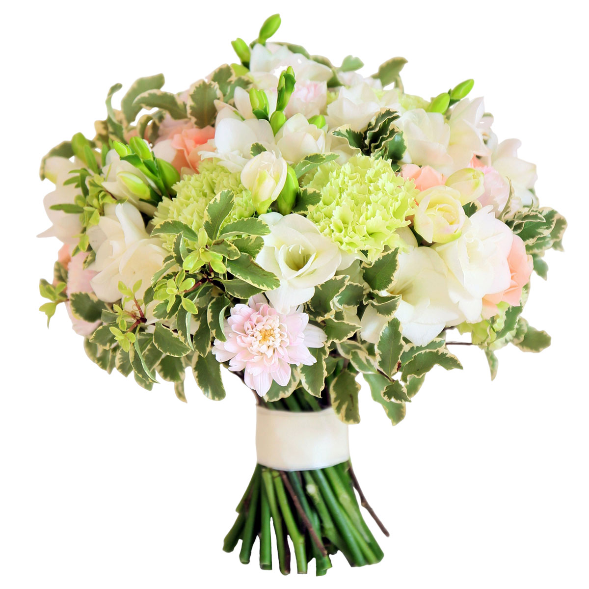 Гвоздика зеленая, фрезия белая, георгина розовая, питтоспорум. Упаковка (лента, пленка, крафт, сетка, пленка матовая)