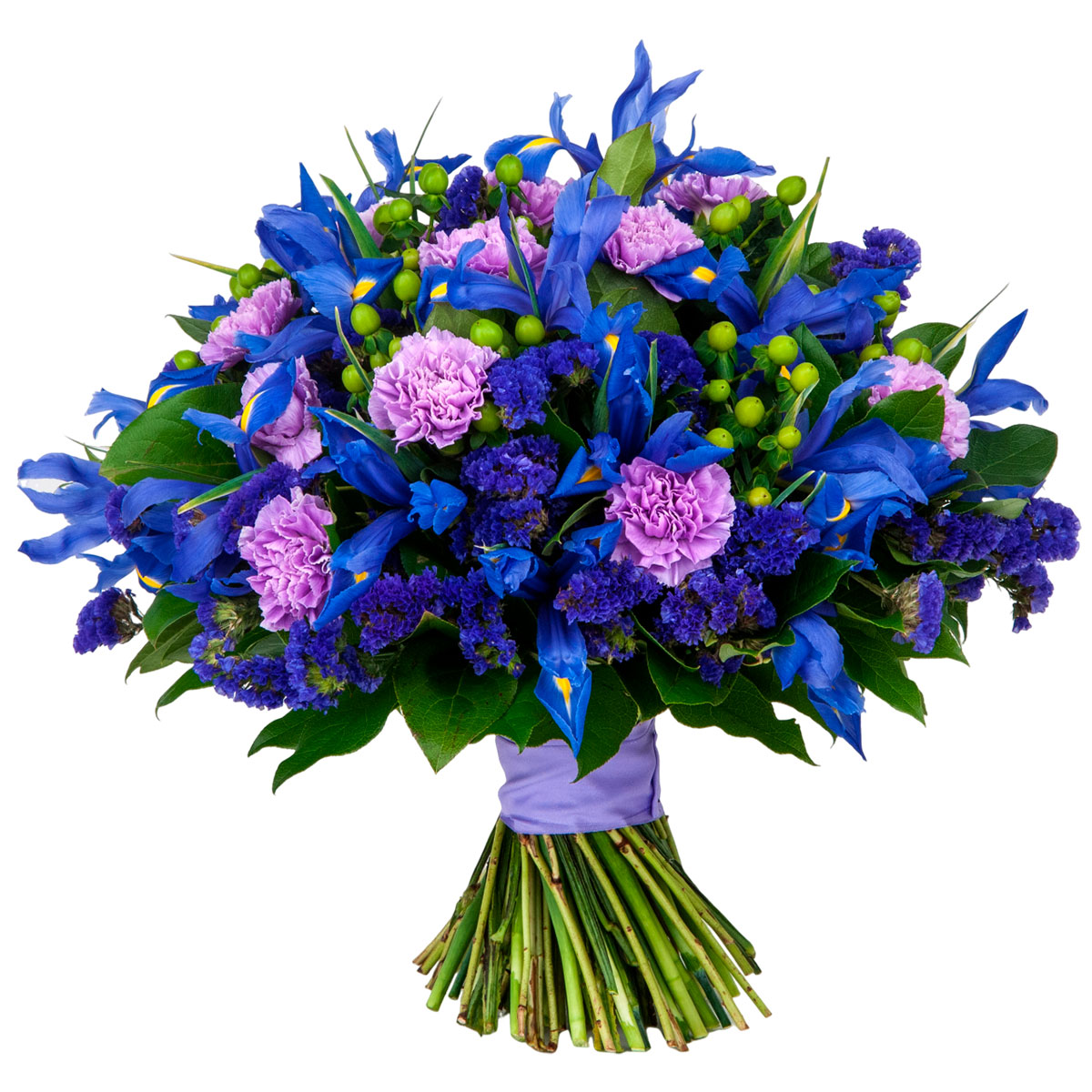 Гвоздика сиреневая, ирис синий, гиперикум, статица синяя, зелень. Упаковка (лента, пленка, крафт, сетка, пленка матовая)