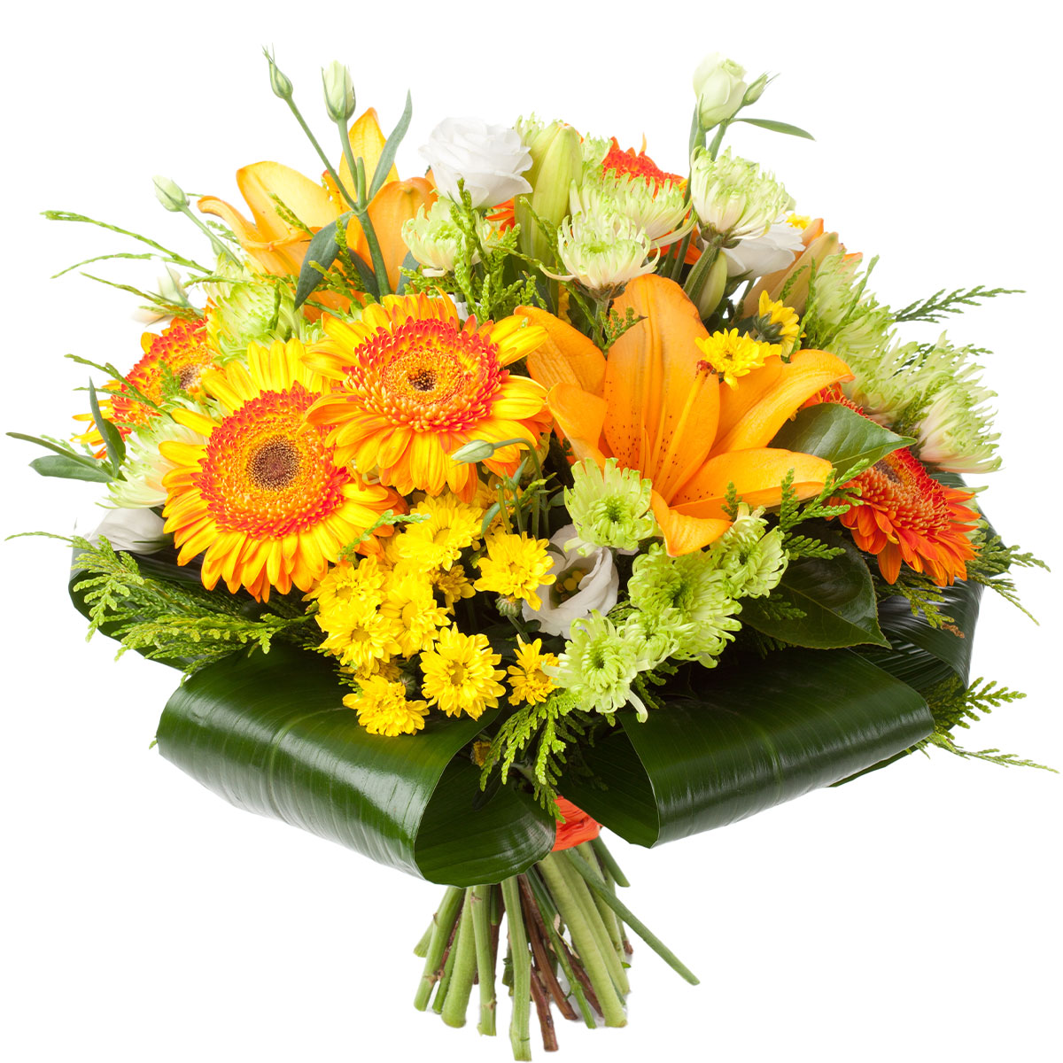 Лилия оранжевая, гербера желтая и оранжевая, хризантема кустовая желтая и зеленая игольчатая, эустома белая, туя, аспидистра. Упаковка (лента, пленка, крафт, сетка, пленка матовая)