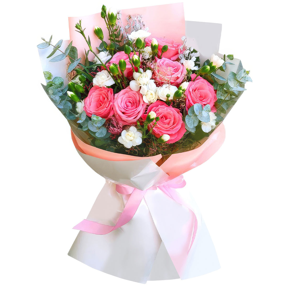 Роза одноголовая розовая, маттиола белая, эвкалипт. Упаковка (лента, пленка, крафт, сетка, пленка матовая)