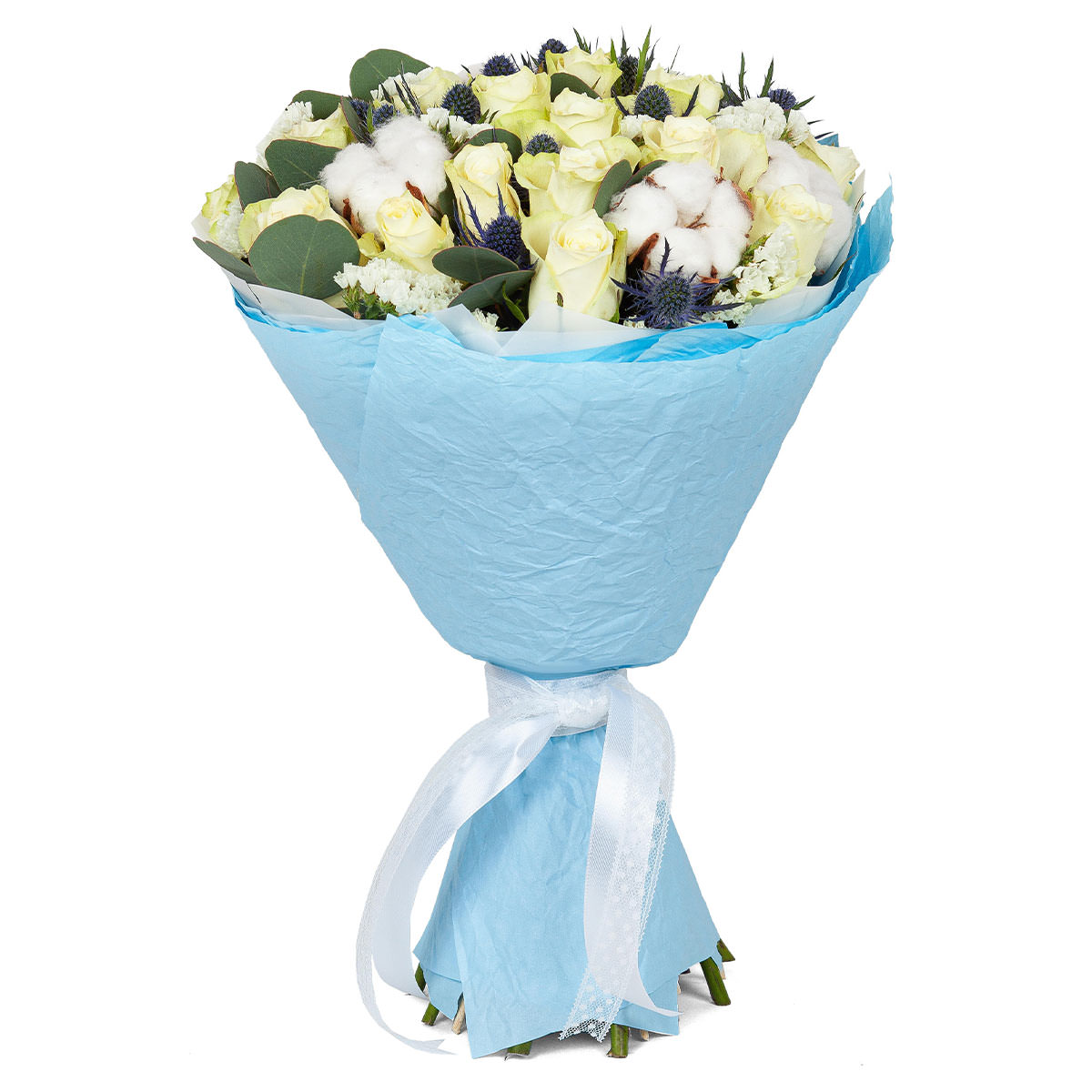 Роза одноголовая кремовая, эрингиум, хлопок, статица белая, эвкалипт. Упаковка (лента, пленка, крафт, сетка, пленка матовая)