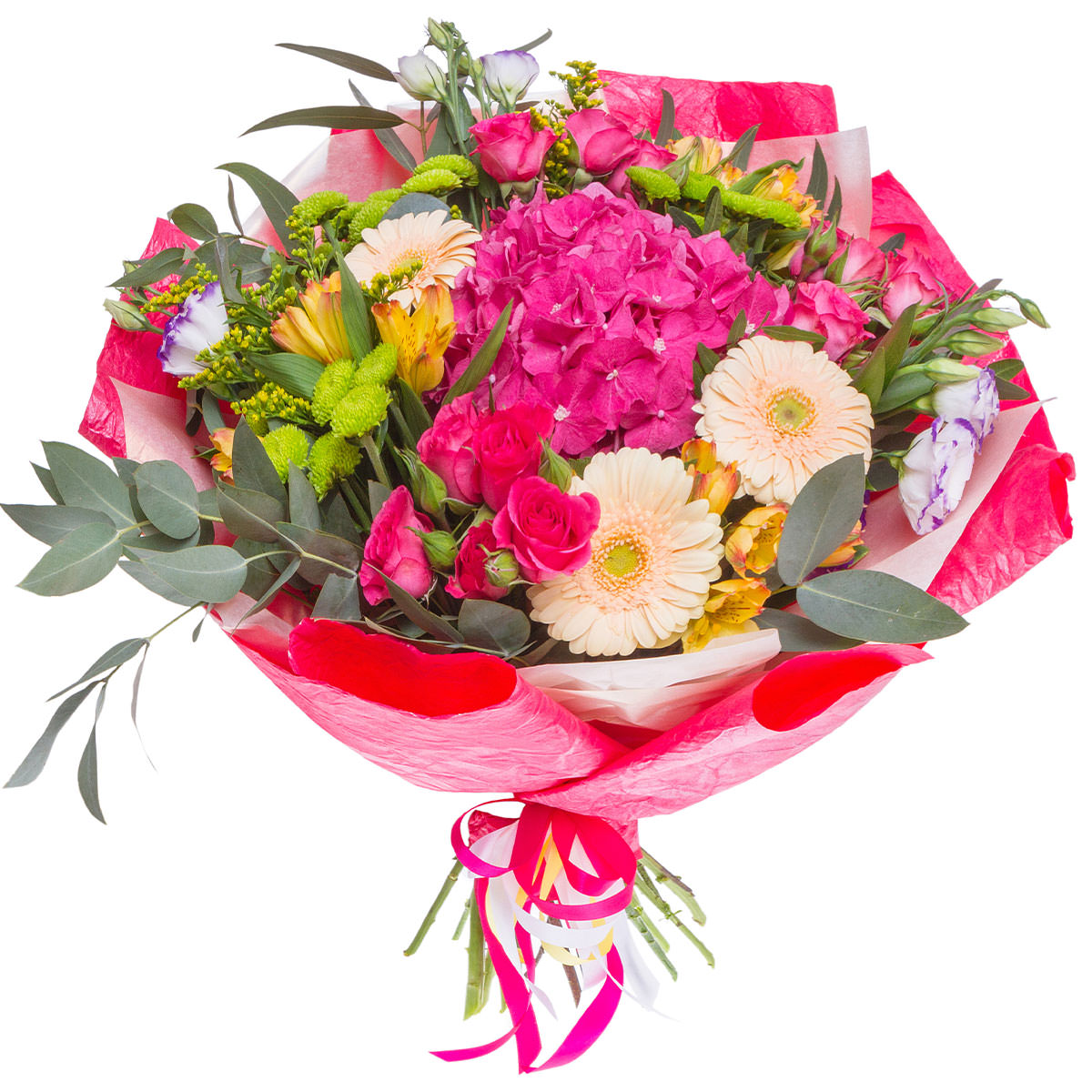 Гортензия розовая, гербера кремовая, роза кустовая розовая, альстромерия желтая, эустома, хризантема мини зеленая, эвкалипт. Упаковка (лента, пленка, крафт, сетка, пленка матовая)