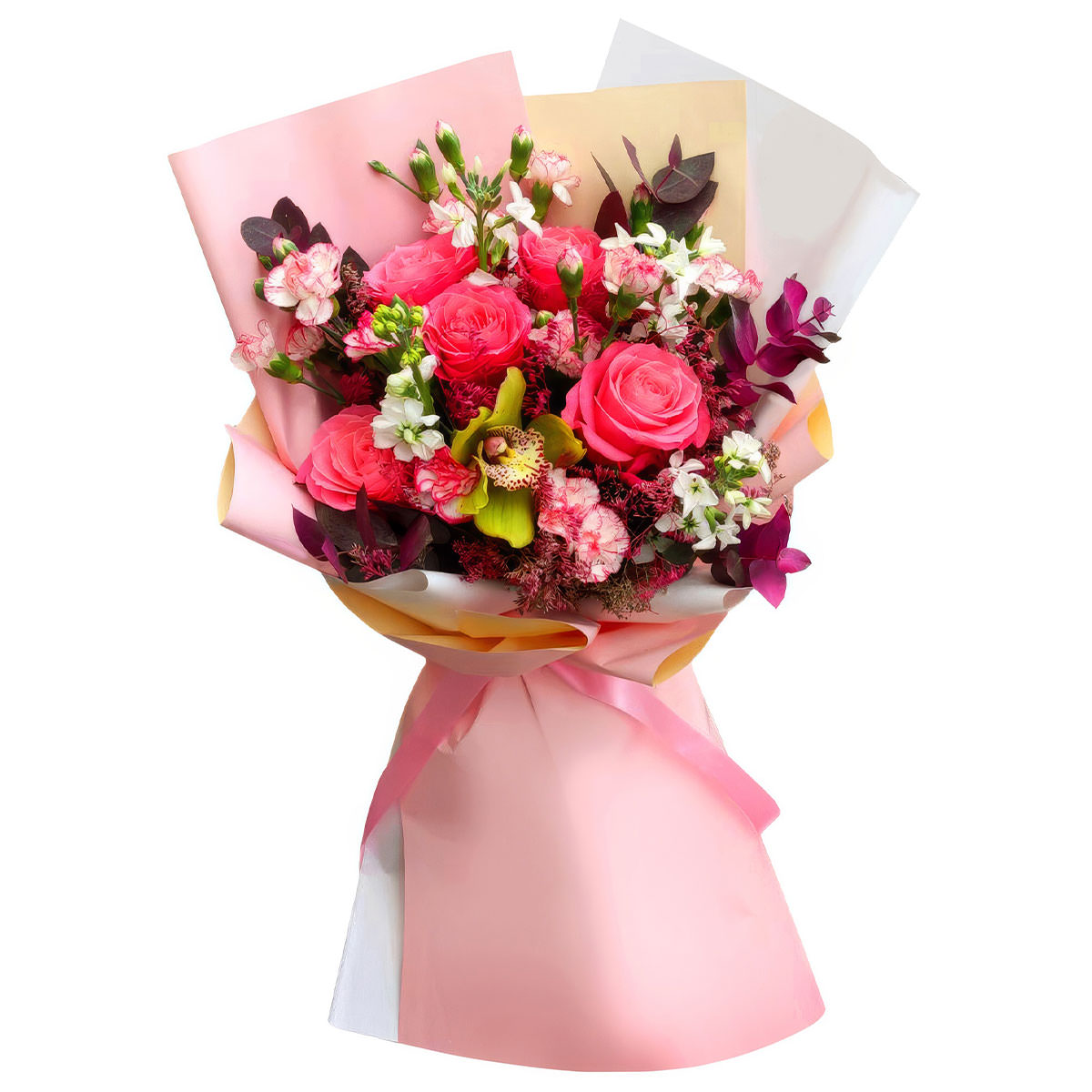 Орхидея желтая, роза одноголовая розовая, гвоздика кустовая розовая, маттиола белая, эвкалипт. Упаковка (лента, пленка, крафт, сетка, пленка матовая)