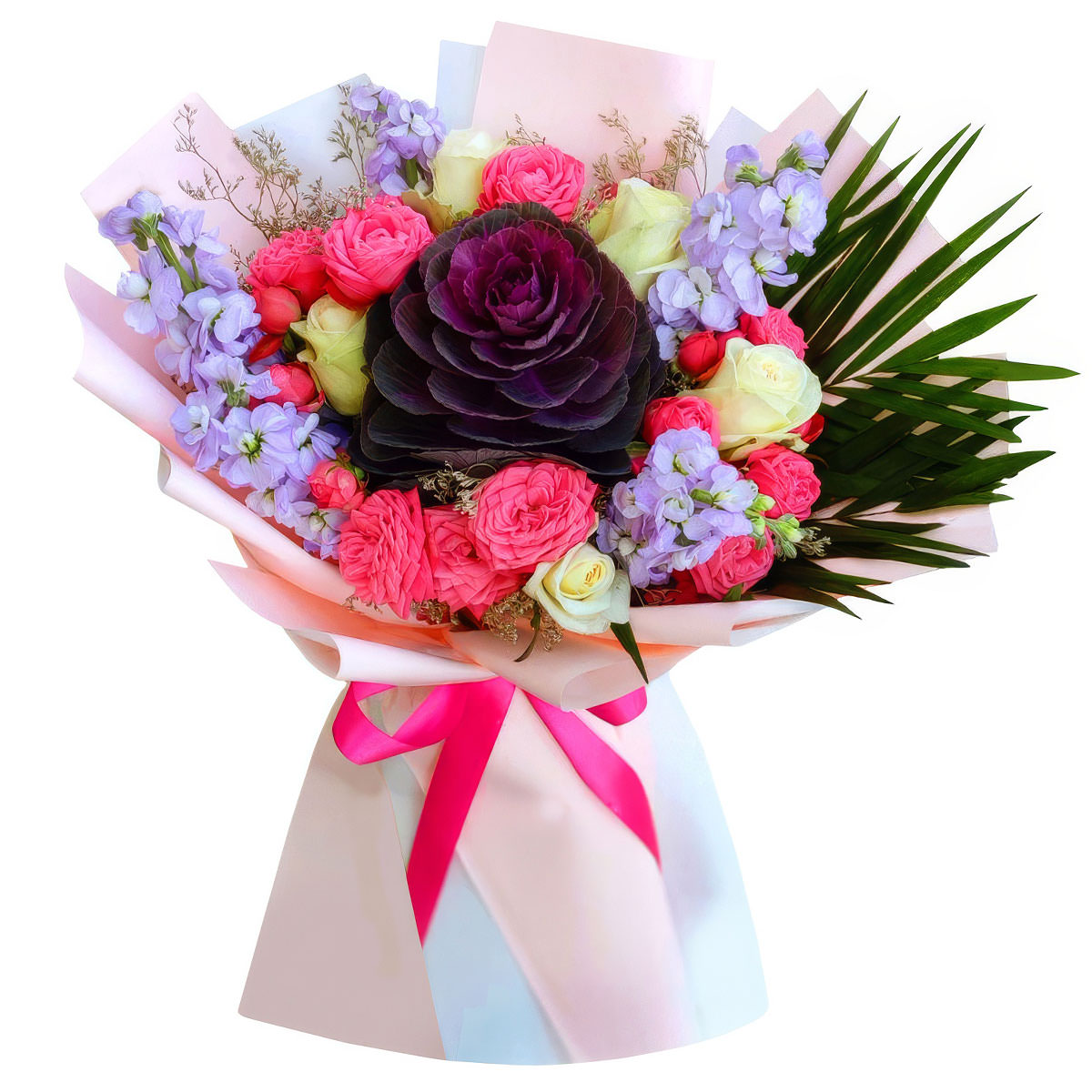 Брассика, маттиола сиреневая, роза кустовая розовая, роза одноголовая кремовая, листья пальмы. Упаковка (лента, пленка, крафт, сетка, пленка матовая)