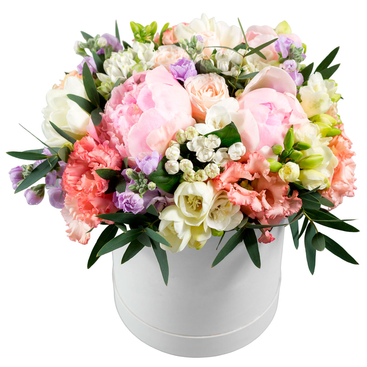Пион розовый, эустома розовая, фрезия белая, маттиола лиловая, роза одноголовая нежно розовая, эвкалипт. Упаковка (шляпная коробка, квадратный бокс, коробка сердце, оазис)