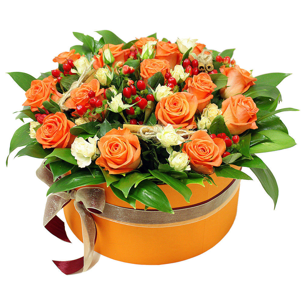 Цветы в коробке «Оранжевый закат» с доставкой по г Казань: вы можете купить букет в цветочном супермаркете «Флормания» по цене от 3190 руб.