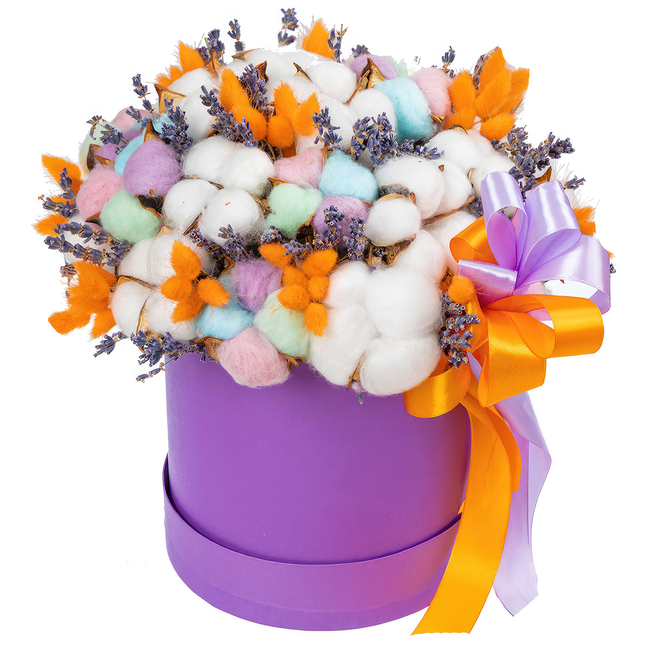 Радужный хлопок, лаванда, лагурус. Упаковка (шляпная коробка, квадратный бокс, коробка сердце, оазис)